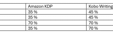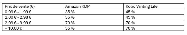 • Kobo Writing Life est plus flexible, sans exclusivité avec un taux de royalties plus favorable pour les livres à bas prix. Cependant, il offre moins de visibilité et d’outils marketing comparé à Amazon.